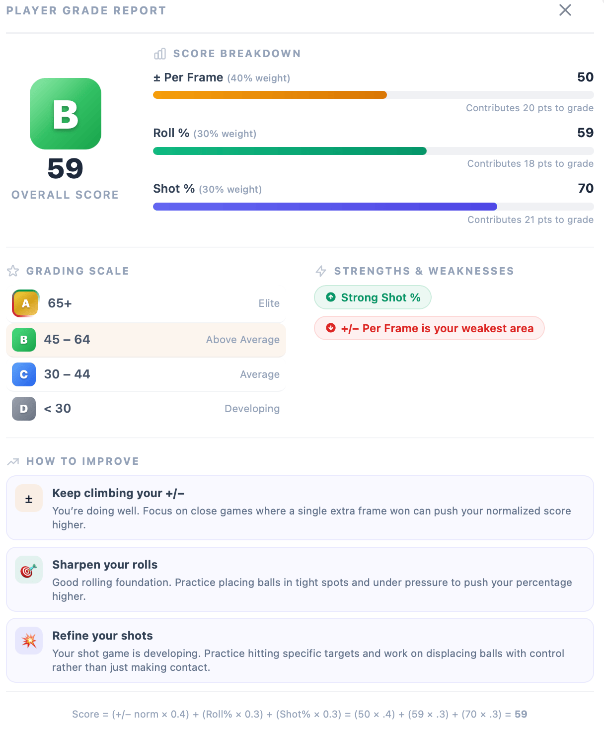 ± Per Frame | 40% | How consistently you win frames, normalized to a 0–100 scale |